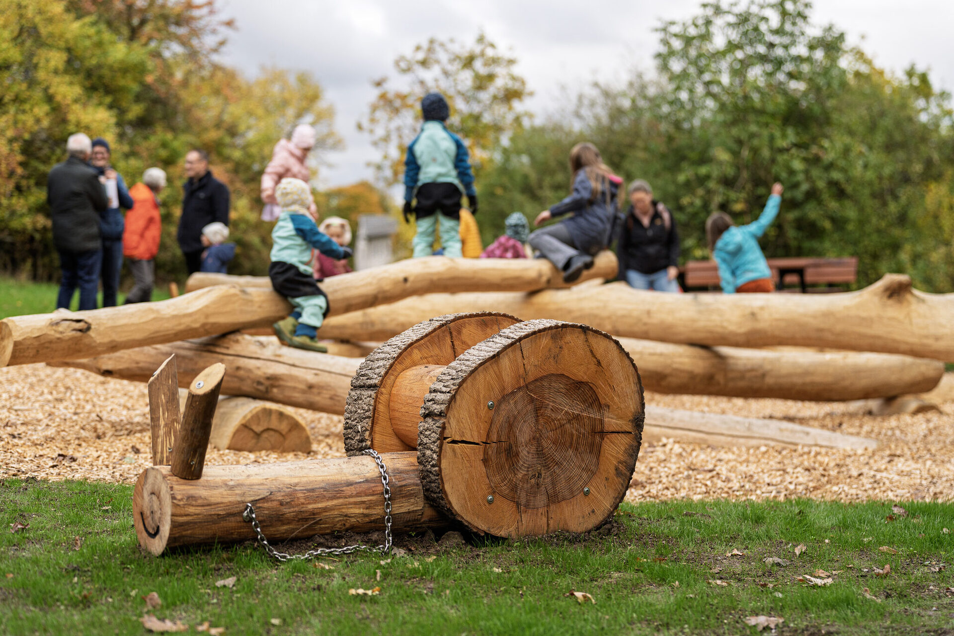 Der Naturspielplatz liegt nahe des Neubaugebiets Mittelberg, umgeben von Bäumen warten Spielgeräte aus Holz auf die Kinder.