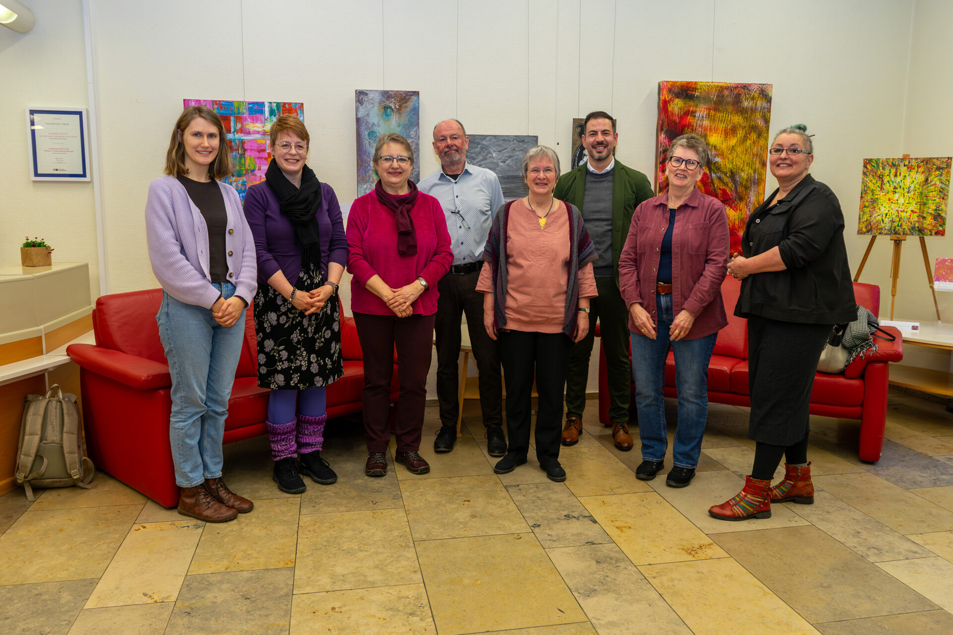 Kreativität und Verwaltung sind kein Widerspruch. Das zeigt eine neue Ausstellung in der Stadtbücherei Coburg. „Ich bin begeistert, auf welch unterschiedliche Weise sich die Kolleginnen und Kollegen ausdrücken“, freut sich 3. Bürgermeister Can Aydin. Nicht nur als zuständiger Referatsleiter, sondern auch als Aussteller hat er die Ausstellung „Die kreative Seite der Stadtverwaltung“ am Mittwochvormittag eröffnet. Bis zum 11. April 2026 können die Besucher*innen der Stadtbücherei selbst diese Kreativität erleben. Wirklich alles ist dabei: Leinwände in den unterschiedlichsten Formaten, bearbeitet mit Öl, Acryl und Aquarell, in Rakel-Technik, Abklebe-Technik und Spritz-Technik. Zwischen farbenfrohen Exponaten beeindrucken Schwarz-Weiß-Kreationen und filigrane Zeichnungen. Manche nutzen als Werkzeug den Föhn, andere arbeiten mit dem Gartenschlauch. Kunst, so sind sich alle Anwesenden einig, mache nicht nur den Kopf frei, sondern verbinde die unterschiedlichsten Menschen. Die Stadtverwaltung „malt“ aber nicht nur. Karin Engelhardt bereichert die Ausstellung als Kunsthandwerkerin mit unterschiedlichsten Lederarbeiten.