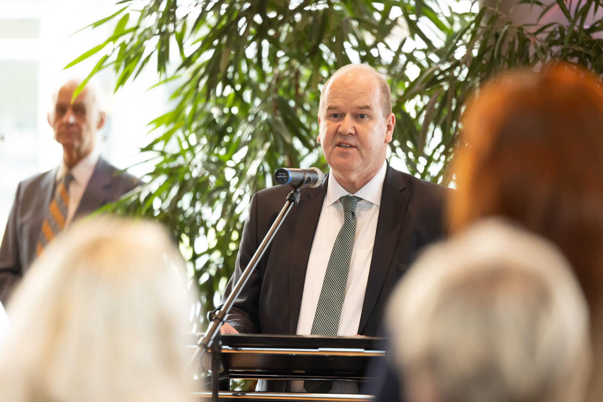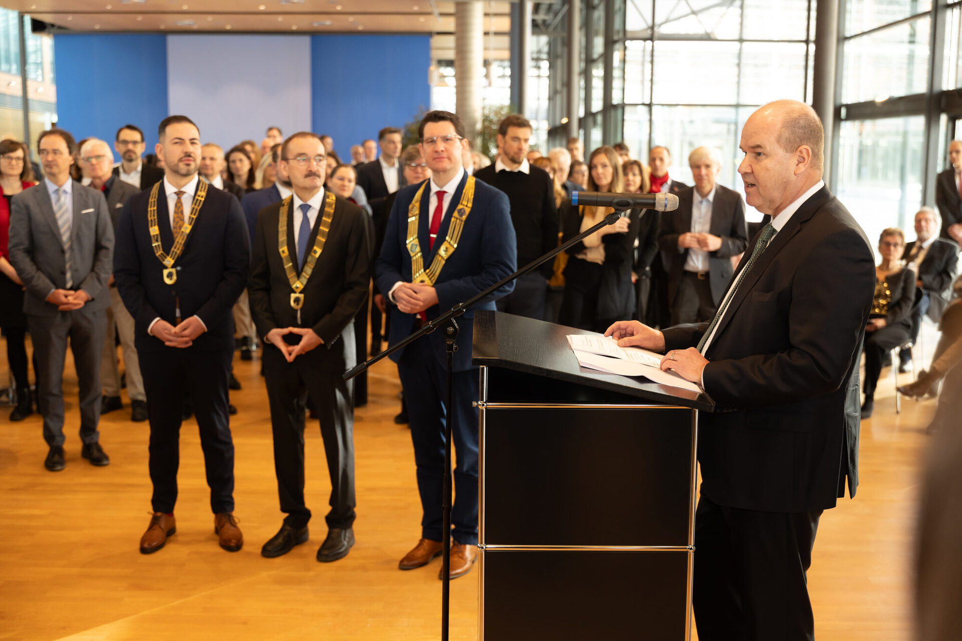 „Es war ein riesengroßer Glücksfall für Coburg“, betonte Oberbürgermeister Dominik Sauerteig gleich zu Beginn seiner Rede. Aus einer Kundenkartei mit 188 Namen habe sich die HUK-COBURG zum größten Arbeitgeber, wichtigsten Gewerbesteuerzahler und zu einem zentralen Stabilitätsfaktor der Stadt entwickelt. Allein in Coburg bietet das Unternehmen heute rund 6.000 Menschen sichere Arbeitsplätze – ein Fundament für viele Familien und für den Wohlstand der Stadt.