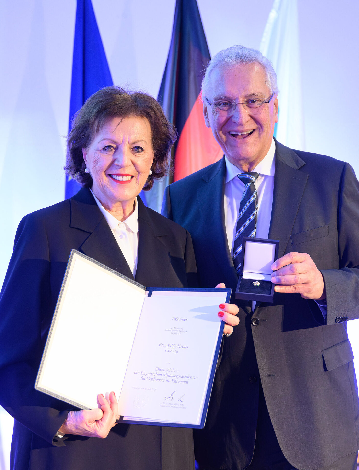 Bayerns Innenminister Joachim Herrmann hat in Nürnberg das Ehrenzeichen des Bayerischen Ministerpräsidenten für Verdienste im Ehrenamt an 60 engagierte Bürger*innen verliehen. Unter den Geehrten waren auch Edda Kroos und Reinhard Wolf aus Coburg, die sich seit vielen Jahren in besonderer Weise für ihre Mitmenschen einsetzen. Innenminister Herrmann würdigte das jahrzehntelange Engagement der Ausgezeichneten.