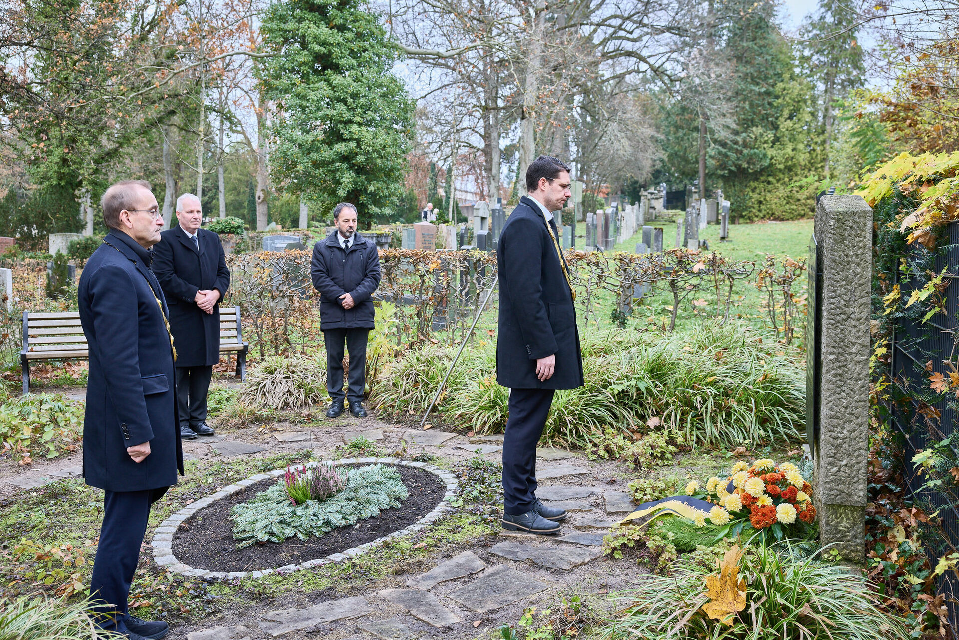 Während der Gedenkveranstaltung zum Volkstrauertag kamen zahlreiche Coburger*innen zusammen, um der Opfer von Krieg und Gewalt zu gedenken. Auch Oberbürgermeister Dominik Sauerteig und 2. Bürgermeister Hans-Herbert Hartan nahmen an der von der Kulturabteilung organisierten Gedenkfeier teil. Nach einem ökumenischen Gedenkgottesdienst in der Morizkirche legten sie unter anderem am Gedenkstein des jüdischen Friedhofes, am Grabmal des Widerstandskämpfers Georg Hansen und am Gemeinschaftsgrab für die Zwangsarbeiter Kränze nieder.