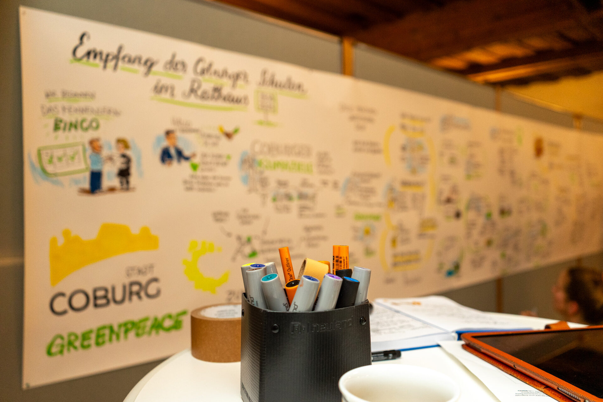 Vertreter*innen von Coburger Schulen kamen im Rathaus zusammen um sich beim „Empfang der Coburger Schulen" auszutauschen und voneinander zu lernen. Oberbürgermeister Dominik Sauerteig würdigte das Engagement der Schüler*innen und Lehrkräfte im Rahmen des „Green Deal Coburg 2030“. „Klimaneutral bis 2040 schaffen wir nur gemeinsam und Schulen spielen dabei eine Schlüsselrolle. Schülerinnen und Schüler von heute sind die Entscheider von morgen“, betonte Sauerteig. Gemeinsam mit der Stadt, Greenpeace und den Coburger Nachhaltigkeitsakteuren machen sich die Schulen auf den Weg zur klimapositiven Schule.