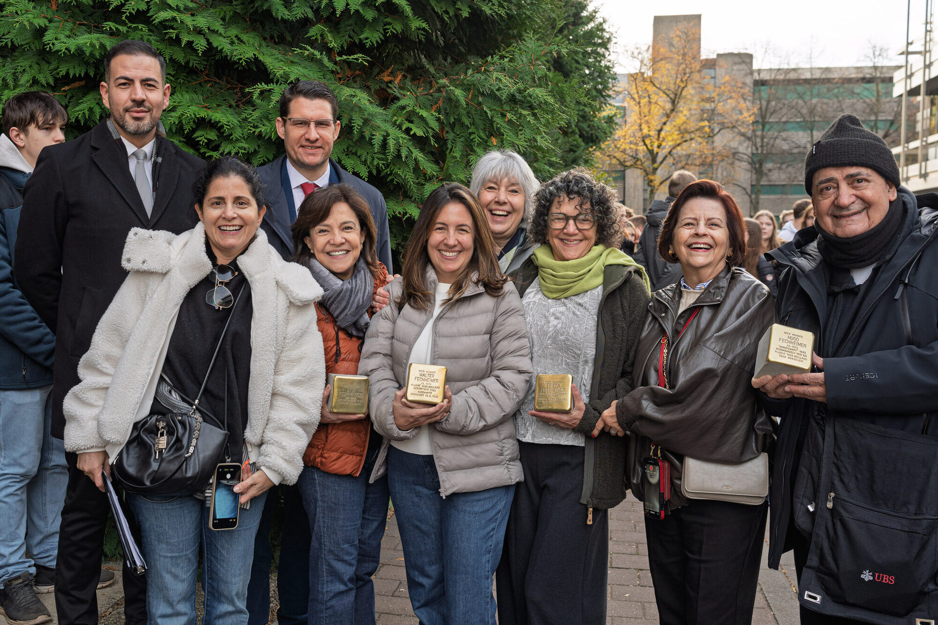 Aus Brazilien, Israel, Portugal, Amsterdam, Singapur und den USA waren sie nach Coburg gekommen. Im Namen der ganzen Familie sprach Daniela Fechheimer Goldin: „Wir danken der Coburger Bevölkerung – fürs Erinnern, fürs Mitfühlen und dafür, dass sie die Geschichte dieser Stadt in ein bewusstes und mitfühlendes Handeln verwandeln. Für uns alle ist es das erste Mal, dass wir hier stehen – an dem Ort, an dem die Geschichte begann. Eine Geschichte, die über Jahrzehnte verloren, verstummt und schlicht vergessen war. Heute kehrt die Erinnerung zurück.“ Vor dem Haus Raststraße 8 erinnern jetzt vier Steine an Otto Fechheimer, Walter Fechheimer, Hugo Fechheimer und Frieda Fechheimer. Die Familie betrieb Coburgs erstes vollwertiges Kaufhaus in der Spitalgasse 12.