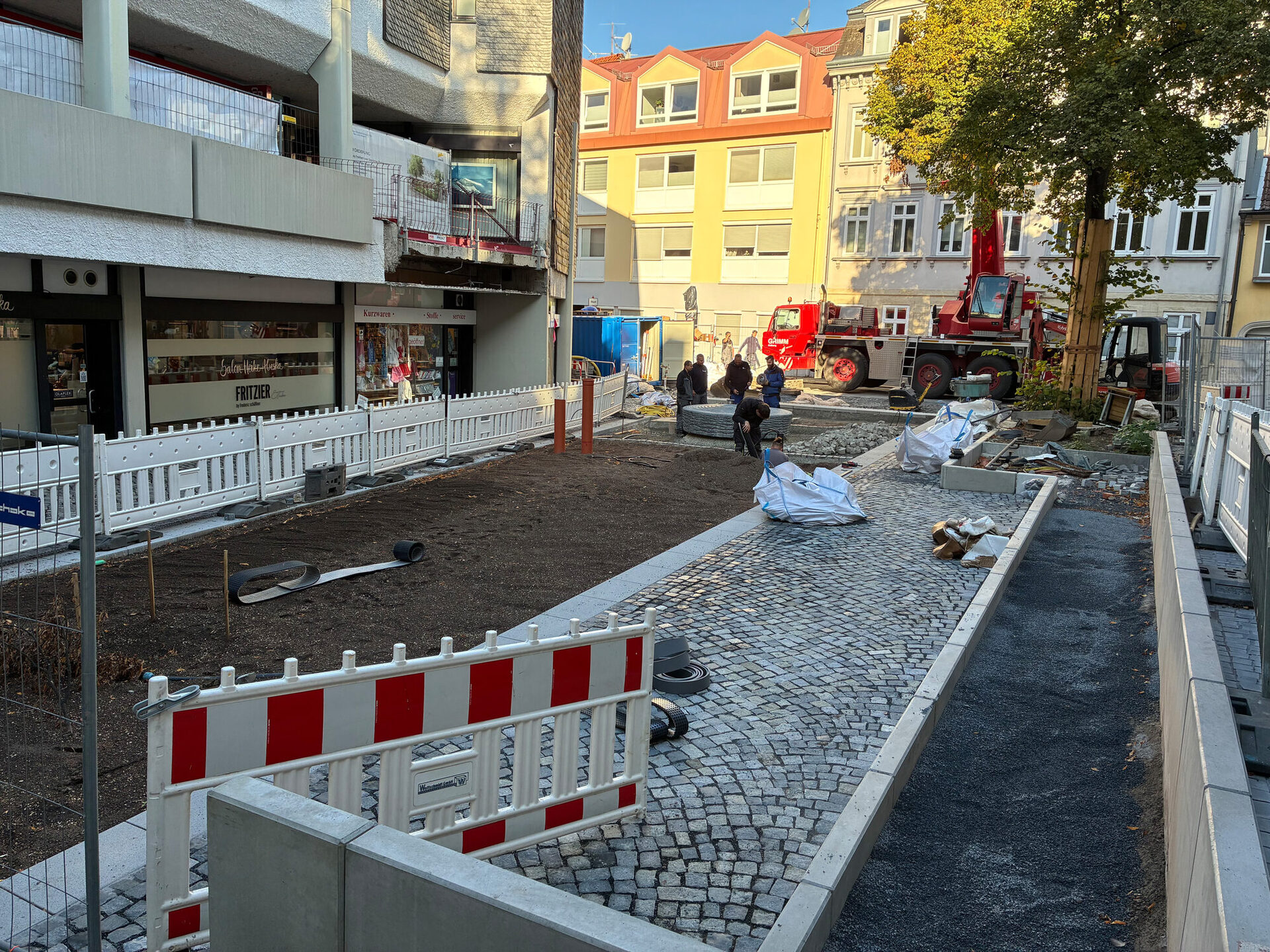 Die finale Form des Freiherr-von-Stockmar-Platzes wird erkennbar. Der Brunnen wurde an neuer Stelle wieder installiert, zwei Lichtstelen und Sitzmöbel lassen Coburgs neues Wohnzimmer erahnen.