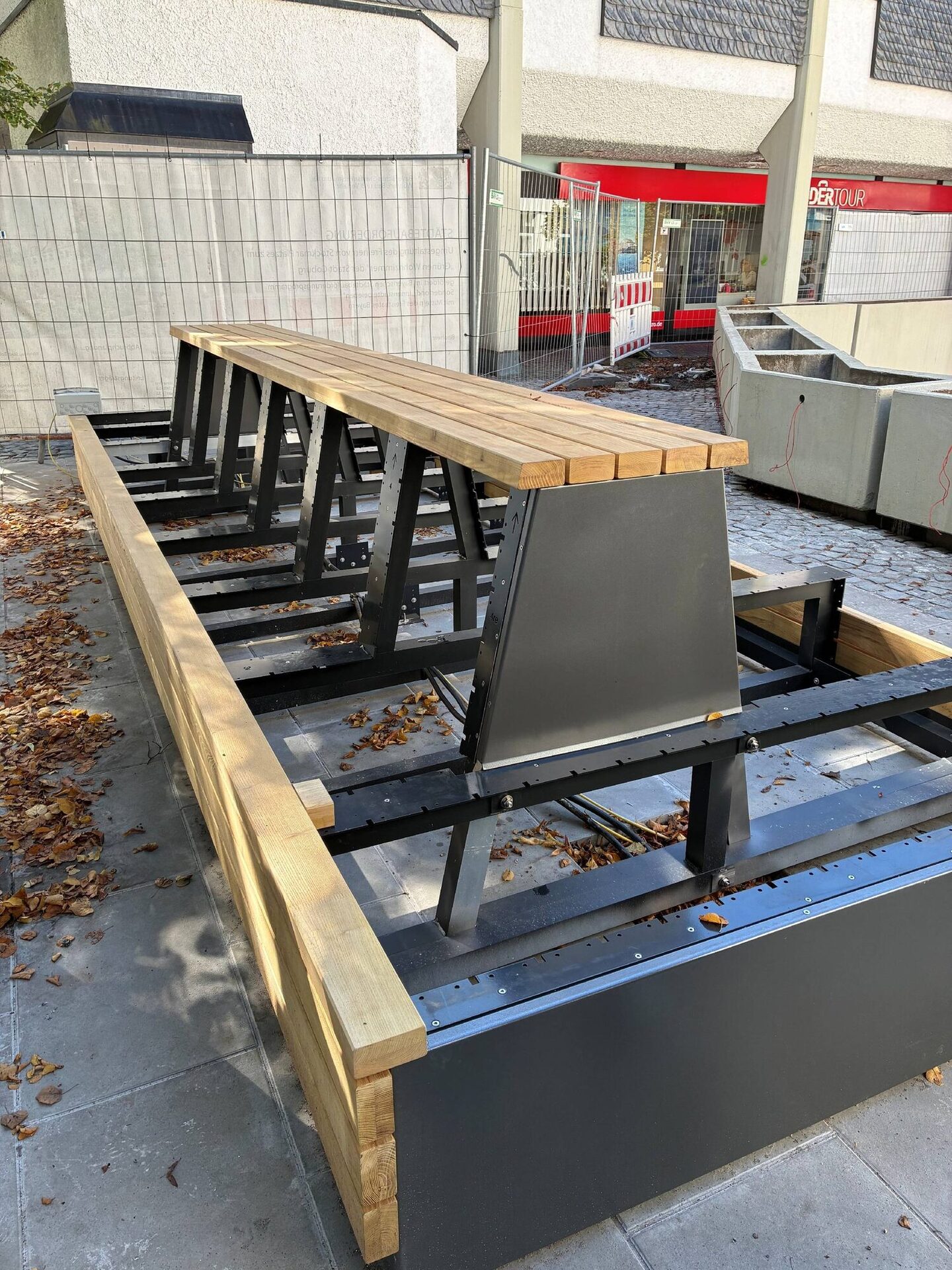 Das Sitzmodul wurde aufgestellt. Nun wird die Beleuchtung installiert und anschließend die Holzverkleidung montiert.