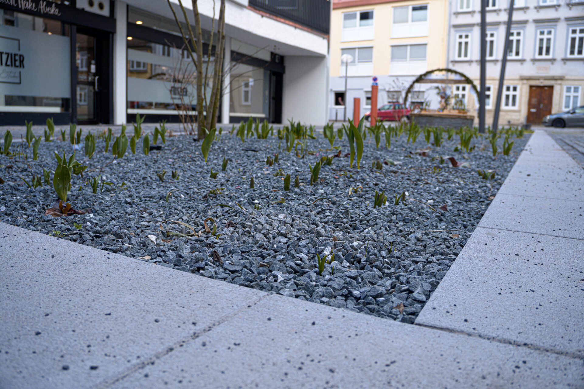 Das „Grüne Wohnzimmer in der steinernen Stadt“ zeigt sich aktuell noch in Grautönen. Statt dunkler Erde bedecken walnussgroße Steine die Beete. „Wenn der Frühling richtig loslegt, wird es hier richtig schnell grün“, sagt Bernhard Ledermann, der Leiter des Grünflächenamtes. Spätestens dann machen sich die Vorteile der Steinschicht bemerkbar.