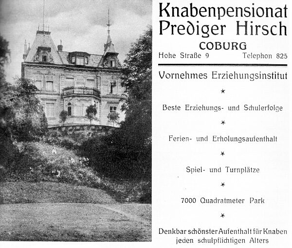 Auch von auswärts kam jüdischer Nachwuchs, um am Casimirianum und am Ernestinum ihren Schulabschluss zu machen. Für sie gab es seit 1876 ein eigenes Internat, das der Prediger Simon Oppenheim betrieb. Darauf aufbauend, eröffnete 1917 der Prediger Hermann Hirsch ein Knabenpensionat. Seit 1919 befand es sich hier im Haus Hohe Straße 30, wo es sich schon nach kurzer Zeit zu einem Erziehungsinstitut mit deutschlandweiter Ausstrahlung entwickelte.