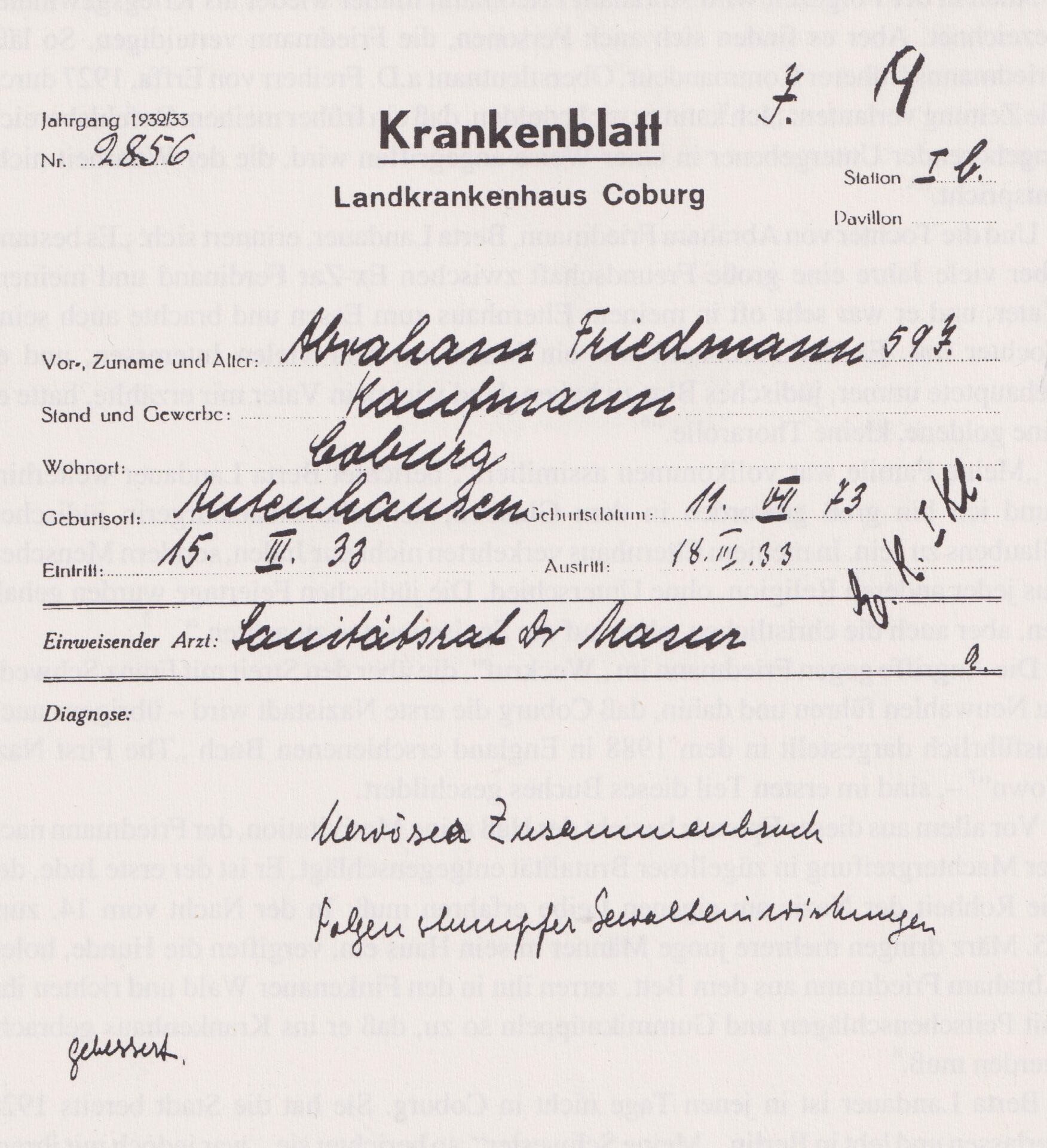 Krankenblatt von Abraham Friedmann nach seiner Misshandlung 1933