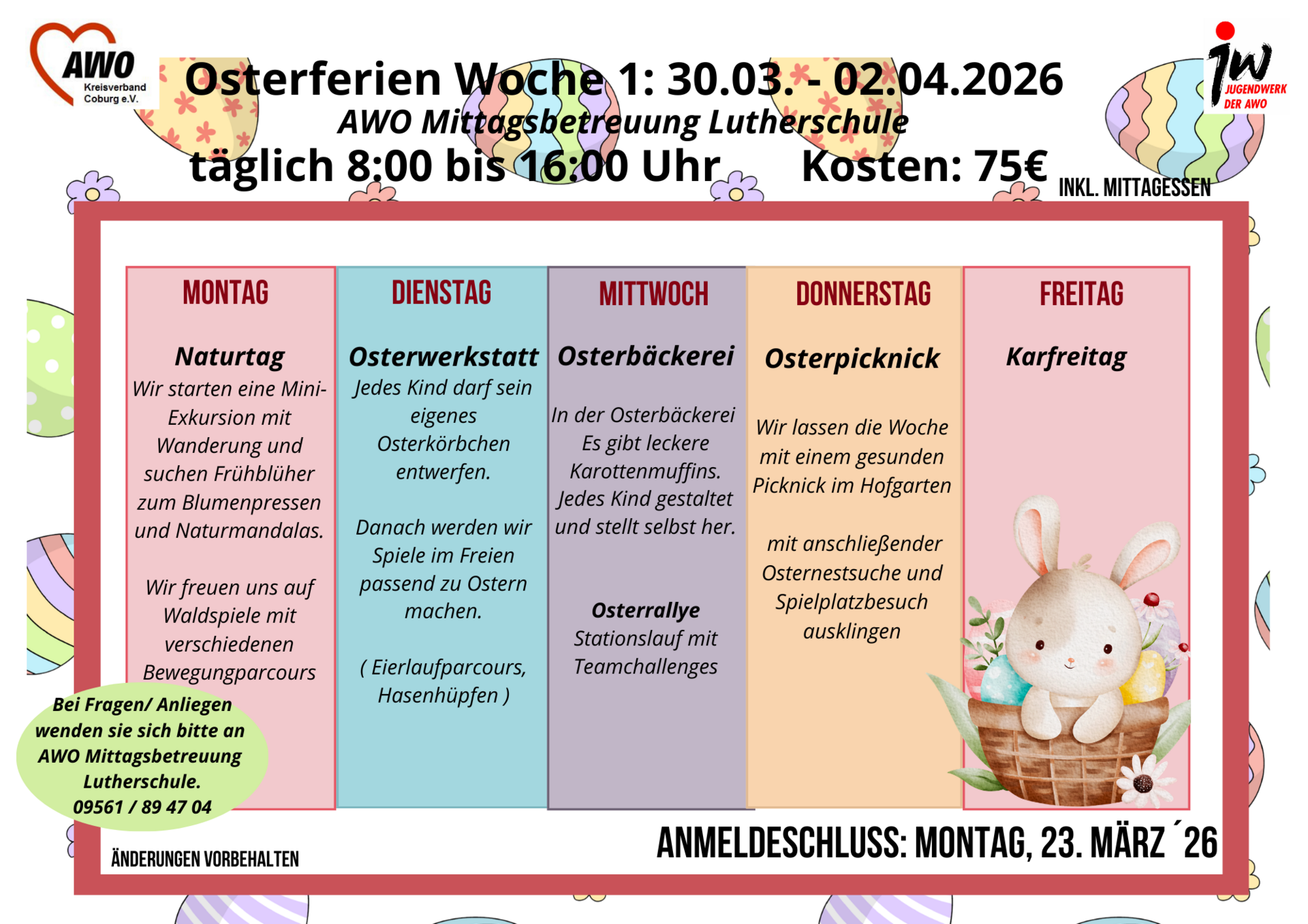 Mittagessen inklusive Anmeldung bis Montag, 23. März 2026 Bringzeit: 08:00 - 09:00 Uhr Abholzeit: bei Bedarf nach Absprache Kontakt bei Rückfragen: 09561/894704 E-Mail: miblu.01awo-coburgde