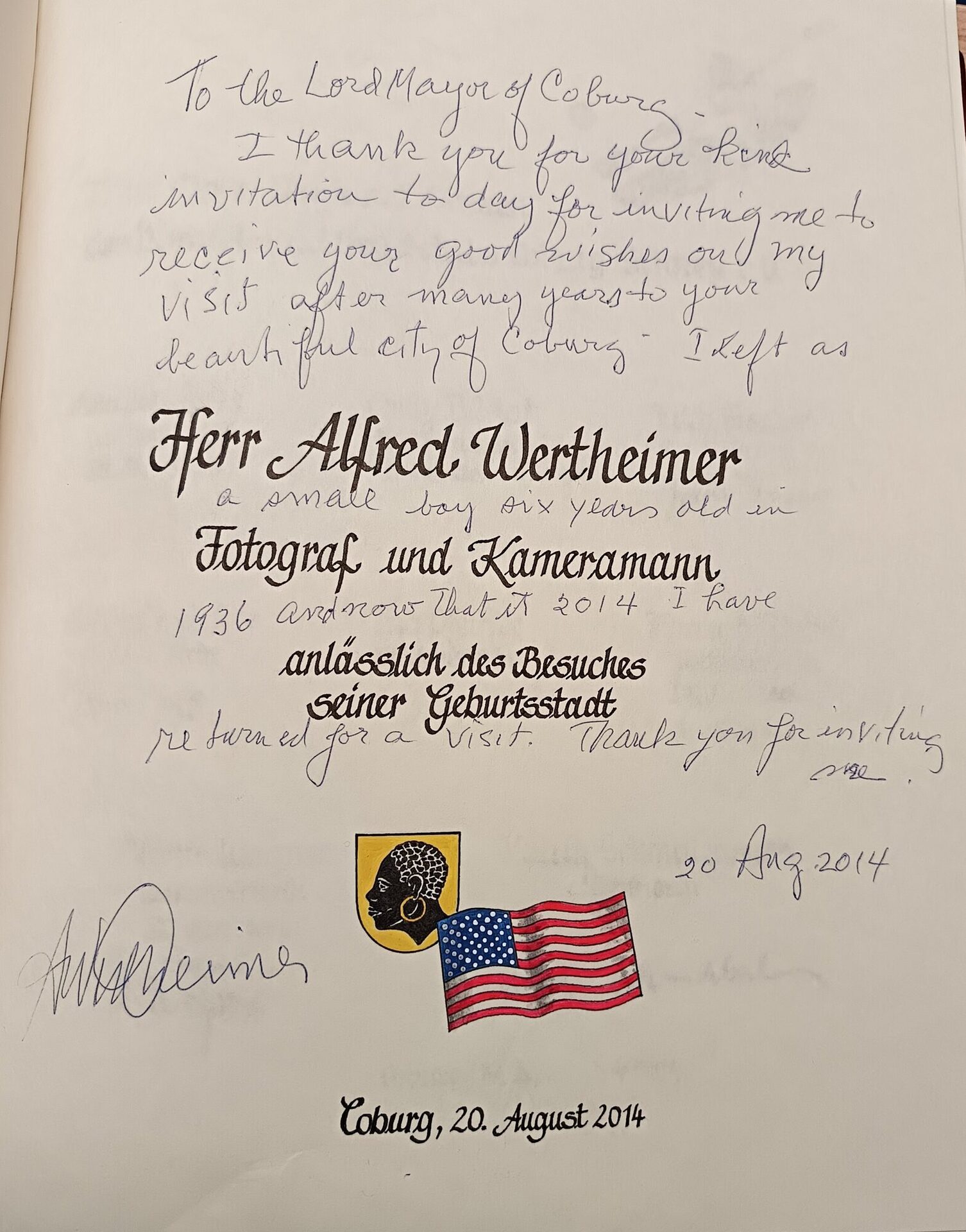 Im August 2014 kehrte Alfred nach 60 Jahre ein letztes Mal in seine Geburtsstadt zurück.[27] Während seines Aufenthalts trug er sich in das Goldene Buch Coburgs ein und besuchte unter anderem die Veste sowie die Schlösser Callenberg und Hohenstein.[28] Zuvor wohnte er noch als hochgeachteter Ehrengast dem „European Elvis Festival“ in Bad Nauheim bei – ein Ort, an dem Elvis selbst während seiner Militärzeit in Deutschland stationiert gewesen war.[29] Während seines Aufenthalts in Deutschland stürzte Alfred Wertheimer schwer, woraufhin sich sein gesundheitlicher Zustand verschlechterte. Kurz nach seiner Rückkehr in die Vereinigten Staaten erlag er den Folgen des des Unfalls. Der international bekannte „Elvis-Fotograf“ starb am 19. Oktober 2014 in New York. Alfred Wertheimer, der nie verheiratet war, hinterließ keine direkten Nachkommen.[30]