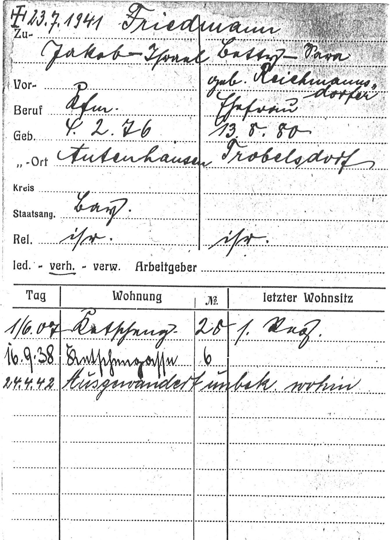 [20] Stadtarchiv Coburg: Einwohnermeldekarte Friedmann, Jakob und Betty.