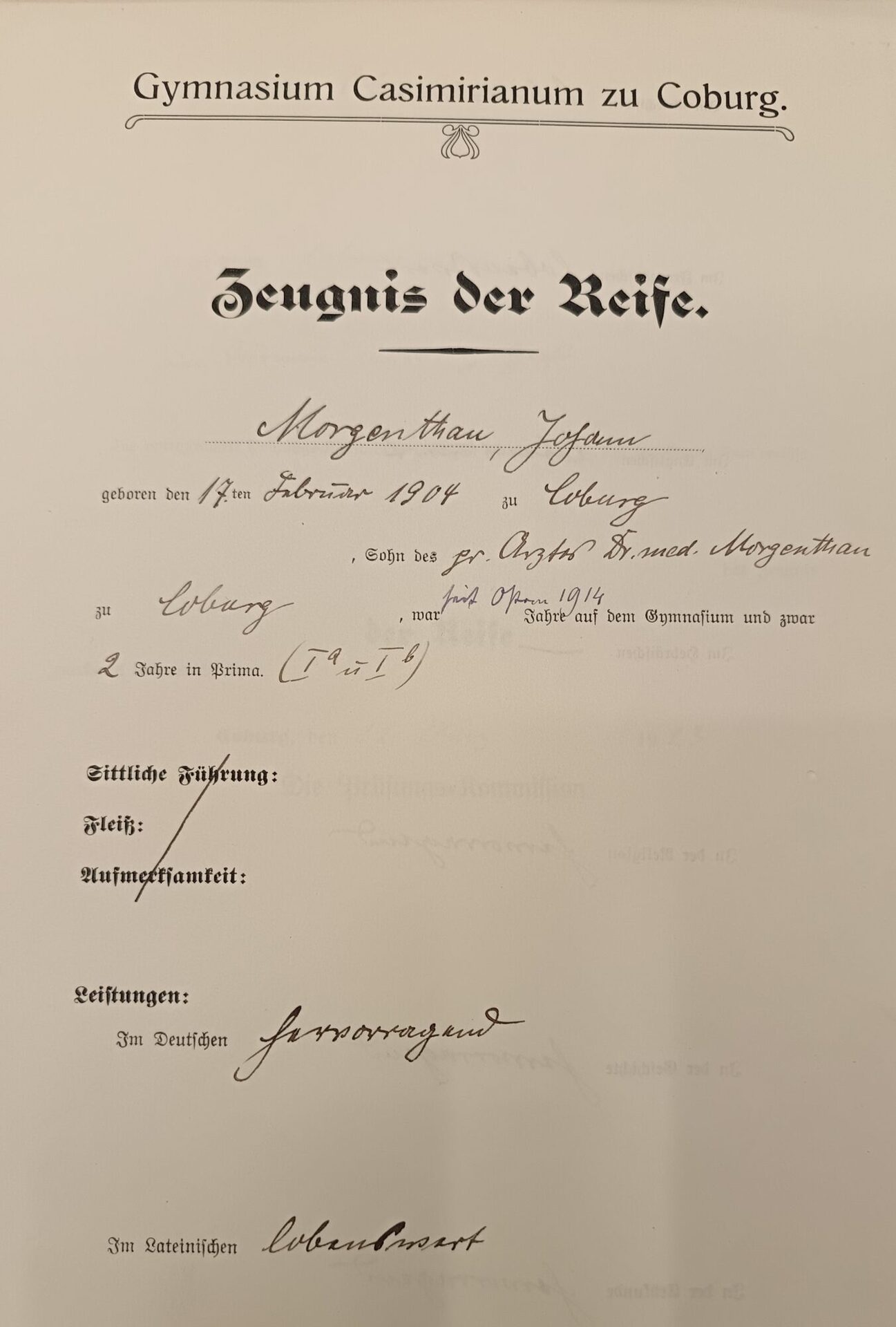 [1] Stadtarchiv Coburg, Einwohnermelde Karte, Morgenthau, Hans; Siehe auch: „Regierungs-Blatt für das Herzogthum Coburg“ vom 27. Februar 1904.