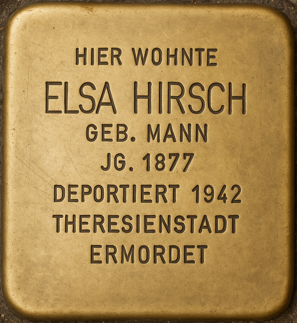 [7] Das Biografische Gedenkbuch der Münchner Juden 1933-1945: Elisabeth (Elsa) Hirsch, geborene Mann, in: Muenchen.de Das offizielle Stadtportal (https://gedenkbuch.muenchen.de/index.php?id=gedenkbuch_transport&tx_mucstadtarchiv_stadtarchivkey%5Bopferid%5D=6065&tx_mucstadtarchiv_stadtarchivkey%5Baction%5D=showopfer&tx_mucstadtarchiv_stadtarchivkey%5Bcontroller%5D=Archiv&cHash=f75e8202958305e02b1b87d8b167a50c (Öffnet in einem neuen Tab)), aufgerufen 25.04.2025.