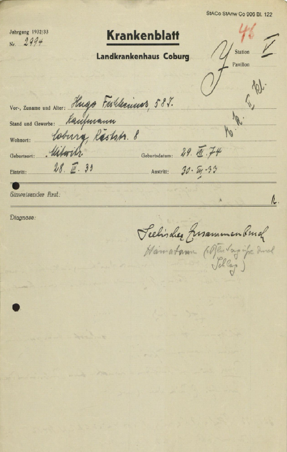 Am 25. März 1933 wurde Hugo Fechheimer von Angehörigen der SA, die in Coburg in Teilen als sogenannte „Hilfspolizei“ fungierten und auf dieser Grundlage polizeiliche Befugnisse beanspruchten, in „Schutzhaft“ genommen.[29] Die Verhängung dieser „Schutzhaft“ stützte sich auf das Ausnahmezustandsregime der Notverordnungen und erfolgte ohne reguläres Verfahren und ohne richterliche Kontrolle. In der Praxis diente sie der gezielten Verfolgung politisch und rassistisch definierter Gegner und war mit systematischen Rechtsverletzungen verbunden.