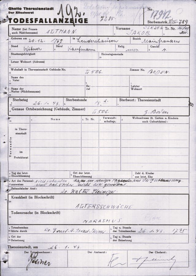In Theresienstadt lebte Jakob Altmann auf einem Dachboden im Haus L 506.[33] Am 26. Januar 1943 starb er mit 75 Jahren an den Folgen von Hunger und schlechter Behandlung im Lager.[34] Sein Vermögen, das nur noch aus Wäsche und Möbeln bestand, wurde schon einen Tag nach seiner Deportation vom Finanzamt Coburg beschlagnahmt. Diese Dinge nahm, wie damals üblich, die NS-Stadtverwaltung an sich.[35]