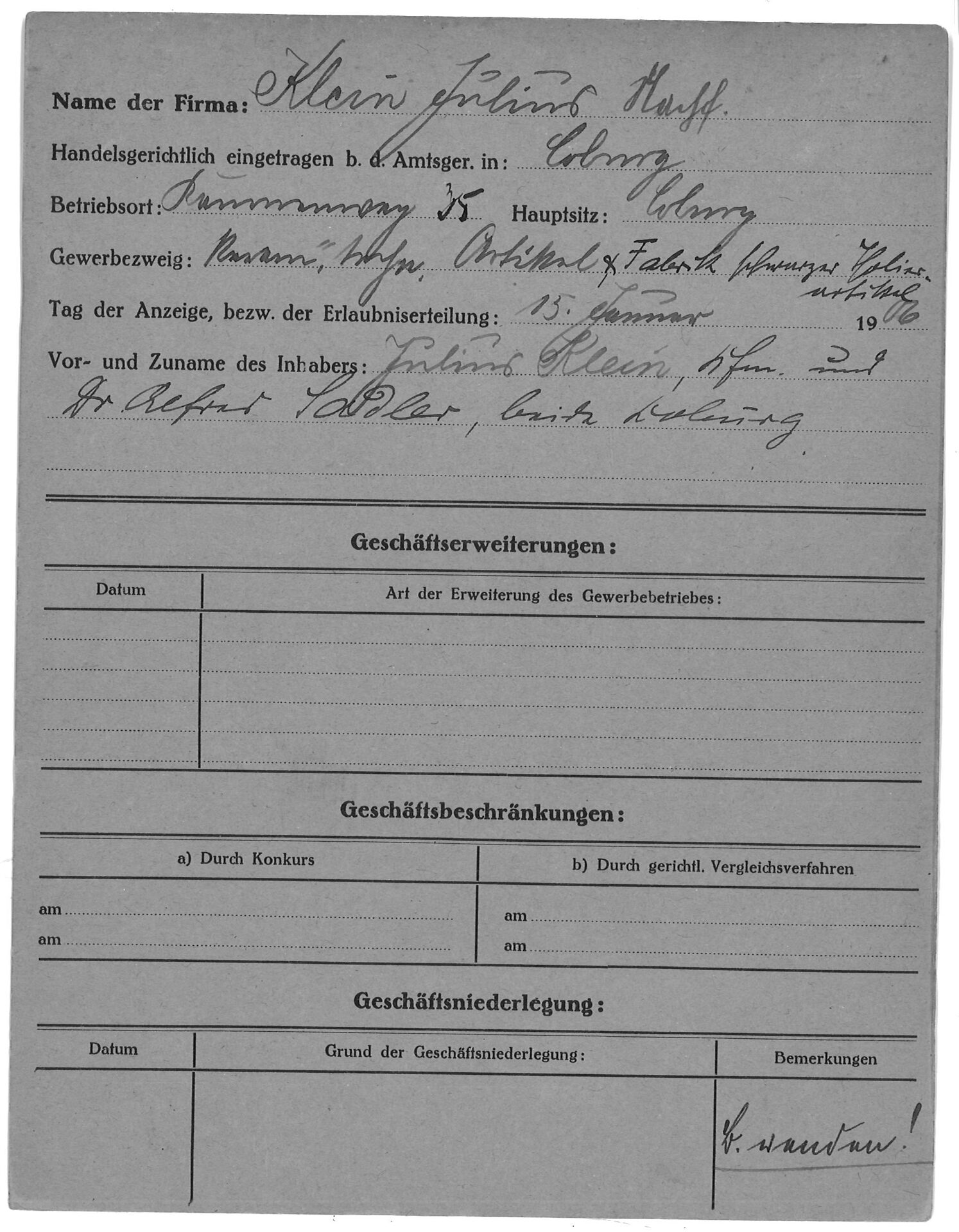 Nach der Machtergreifung Hitlers im Jahr 1933 blieben Julius Klein und seine Familie zunächst von persönlichen Schikanen und Repressalien verschont. Am 16. Februar 1935 übergab Julius Klein seinem Sohn Hans, der nach seiner Schulzeit eine Lehre als Kaufmann erfolgreich abgeschlossen hatte[34], das Geschäft. Die Firma führte nun den Namen „Klein & Co.“. Julius Klein schied jedoch nicht gänzlich aus dem Unternehmen aus. Als Kommanditist war er weiterhin mit einer Einlage von 5.043 Reichsmark beteiligt und somit wirtschaftlich in das Unternehmen eingebunden.[35]