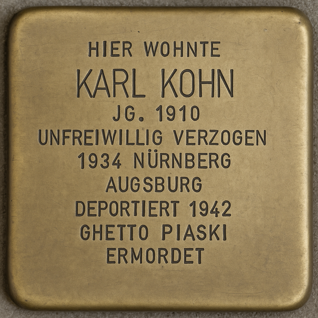 In den Monaten nach seiner Freilassung verließ Karl Kohn Coburg. Ob dieser Schritt unmittelbar auf die Misshandlungen zurückzuführen war, lässt sich mangels persönlicher Zeugnisse nicht abschließend beurteilen. Die Umstände sprechen jedoch dafür, dass die politische und soziale Verfolgung eine entscheidende Rolle spielte. 1934 zog Kohn zunächst nach Nürnberg, blieb dort jedoch nur etwa ein Jahr. Anschließend übersiedelte er nach Augsburg, wo er als Buchhalter tätig war.[12] Aus städtischen Meldeunterlagen geht hervor, dass er zwischen Januar 1940 und Februar 1942 zudem in München gemeldet war und dort zeitweise als Hilfsarbeiter arbeitete.[13]