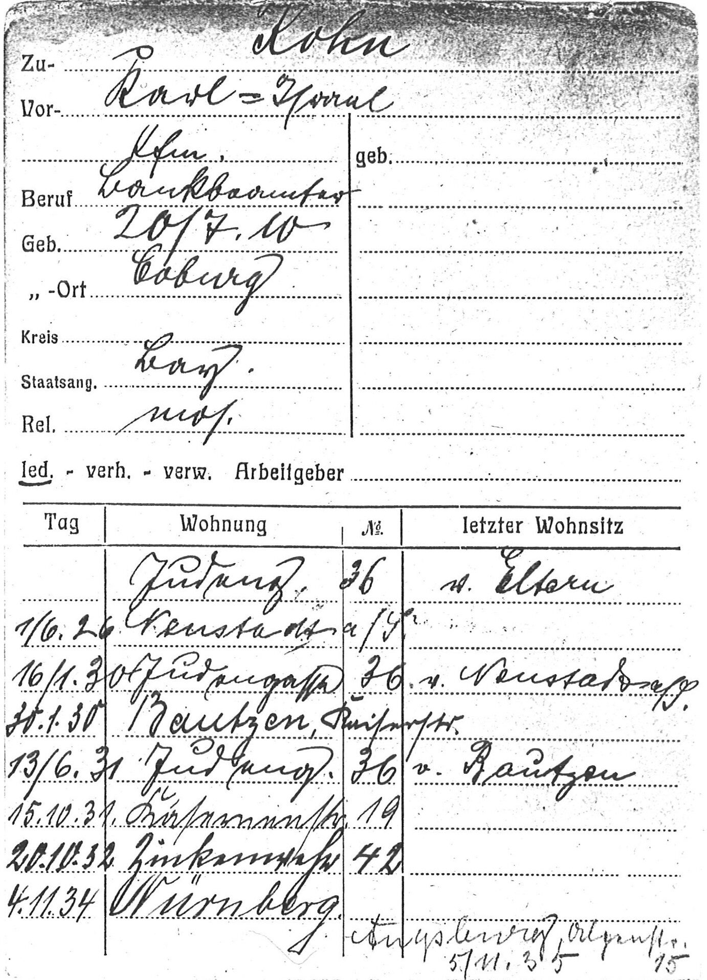 [7] Stadtarchiv Coburg, Einwohnerkartei, Kohn, Karl