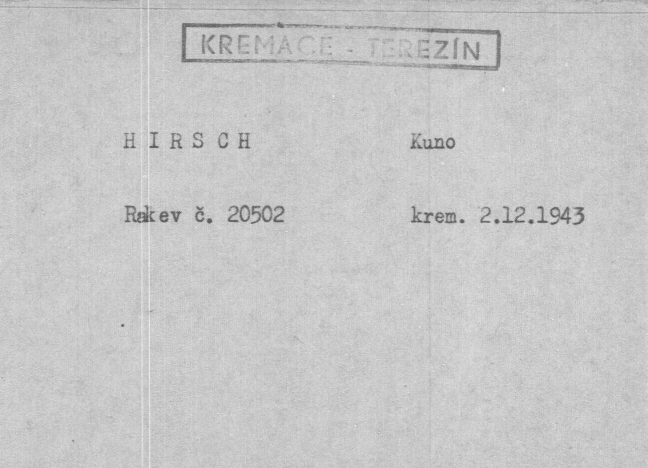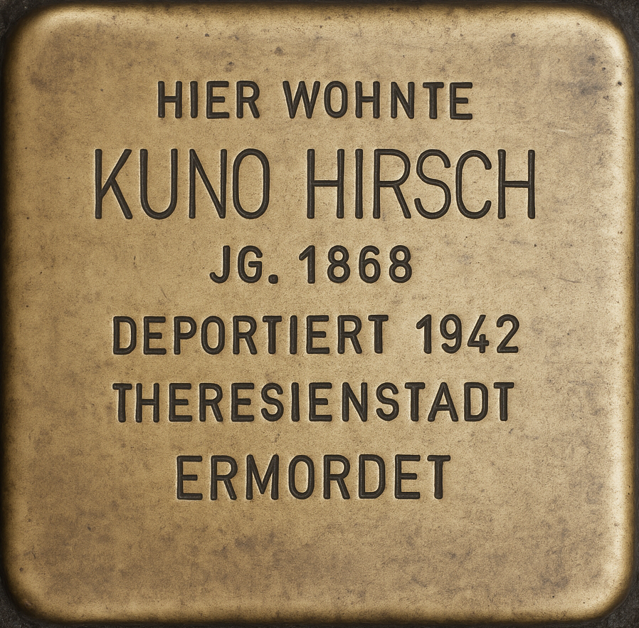 Kuno Hirsch starb am 1. Dezember 1943 im Alter von 75 Jahren im KZ Theresienstadt. Am darauffolgenden Tag wurde sein Leichnam im dortigen Krematorium verbrannt.[53]