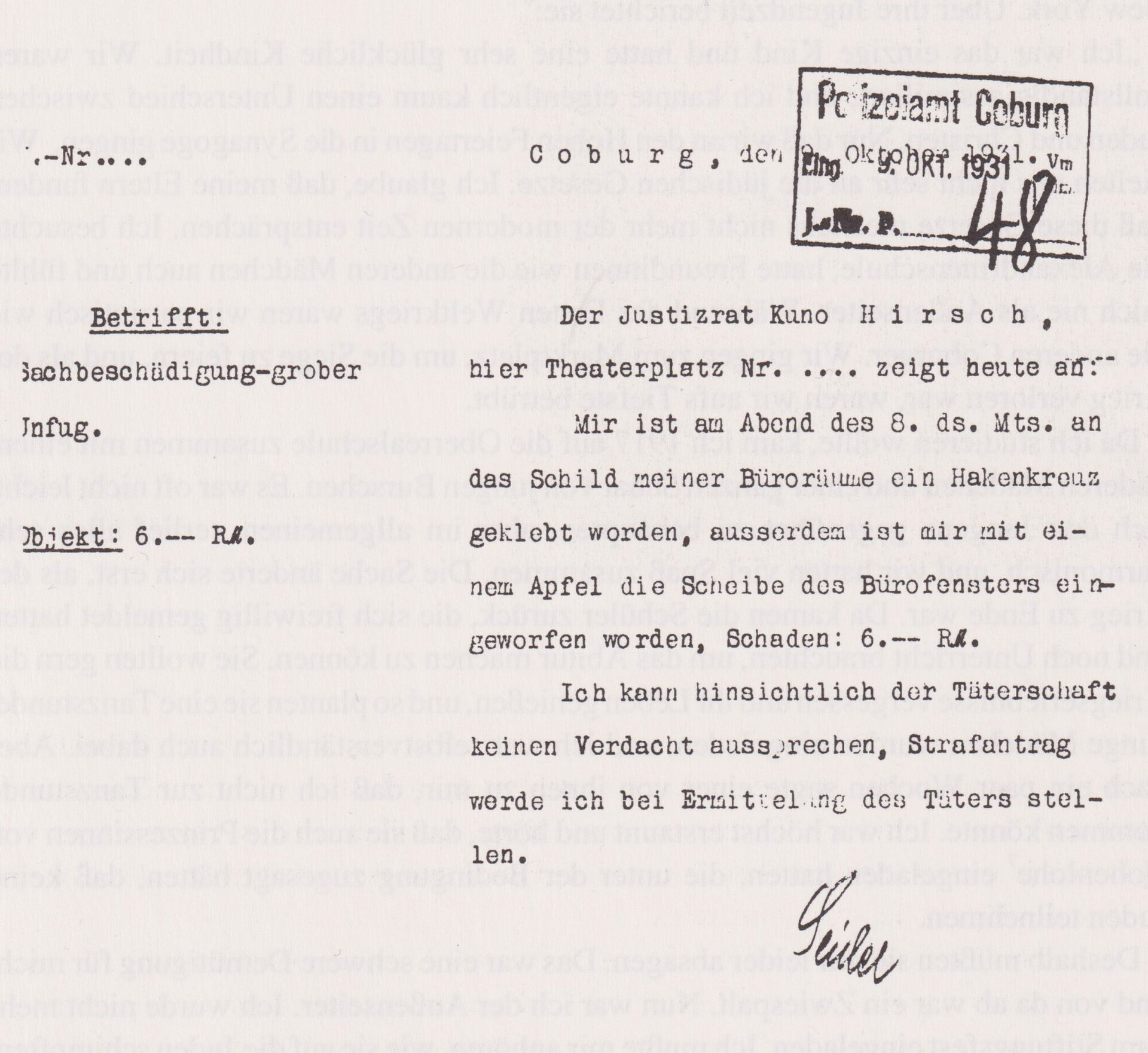 Kuno Hirsch war als prominenter Jude schon früh dem Antisemitismus ausgesetzt. Schon im September 1923 griff der Völkische Beobachter Hirsch öffentlich an und warf ihm vor, in seiner Funktion im Theaterausschuss deutsche Künstler systematisch durch jüdische zu ersetzen – eine Behauptung, die in antisemitischer Rhetorik wurzelte.[33] Die Angriffe gegen Hirsch blieben nicht auf Worte beschränkt: 1931 wurden die Fenster seiner Büroräume eingeworfen, und sein Praxisschild wurde mit Hakenkreuzen beschmiert. Trotz der offensichtlichen politischen Motive der Täter wurden diese Taten nicht aufgeklärt.[34]
