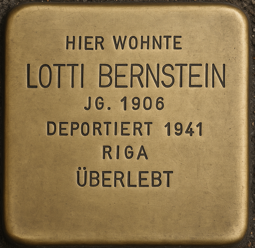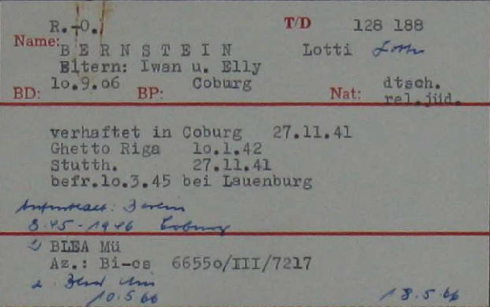[8] Stadtarchiv Coburg, Einwohnerkartei, Bernstein, Lotti; Siehe auch: Bundesarchiv, Abteilung R (Deutsches Reich), Liste der jüdischen Einwohner im Deutschen Reich 1933–1945 (kurz: "Residentenliste"). ID-Nr. 842053.
