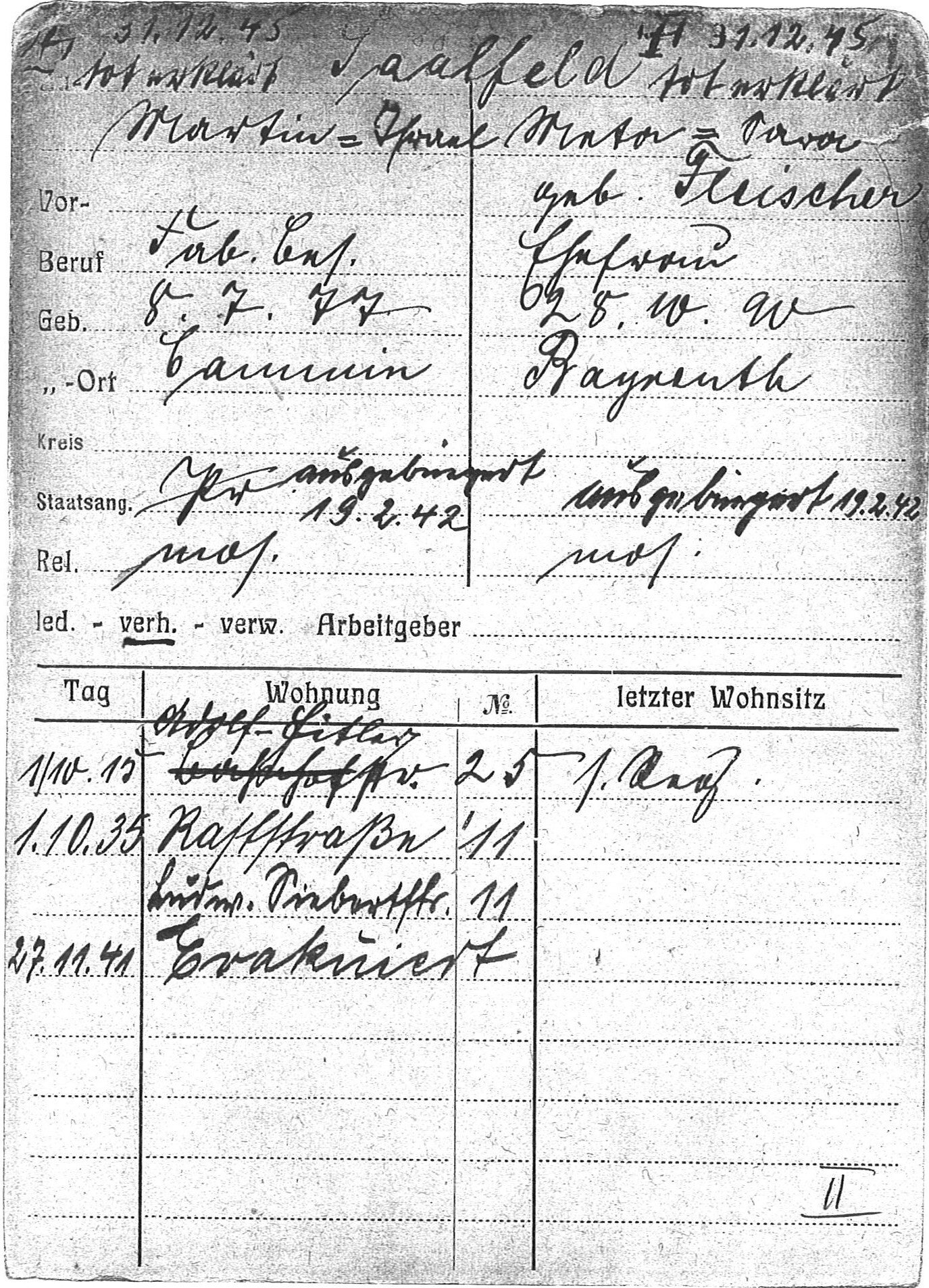 [12]  Stadtarchiv Coburg, Einwohnerkartei, Saalfeld Martin und Meta.