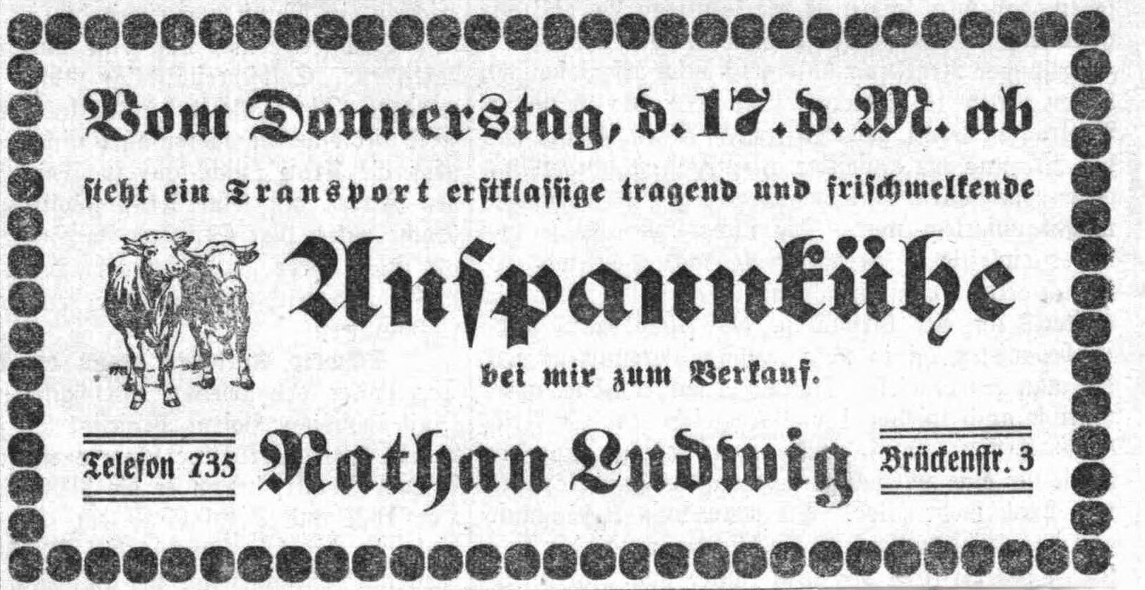 Insgesamt gestalteten sich die Kriegsjahre für die Viehhandlung Ludwig sehr erfolgreich. Im Jahr 1919 erwarb Nathan für seine Familie ein Wohnhaus in der Brückenstraße 3 (heute Gartenstraße 3).[14] Ende der 1920er Jahre verschlechterte sich die wirtschaftliche Lage des Betriebs. 1929 wurde ein Konkursverfahren eröffnet.[15] Zwar bestand die Viehhandlung nach Abschluss des Verfahrens weiter, doch die finanziellen Schwierigkeiten hielten an. 1932 verkaufte Ludwig sein Haus[16]; ob dies eine direkte Folge der wirtschaftlichen Probleme war, lässt sich aus den verfügbaren Quellen nicht eindeutig erschließen. Er und seine Familien blieben weiterhin in dem Gebäude wohnen.[17]