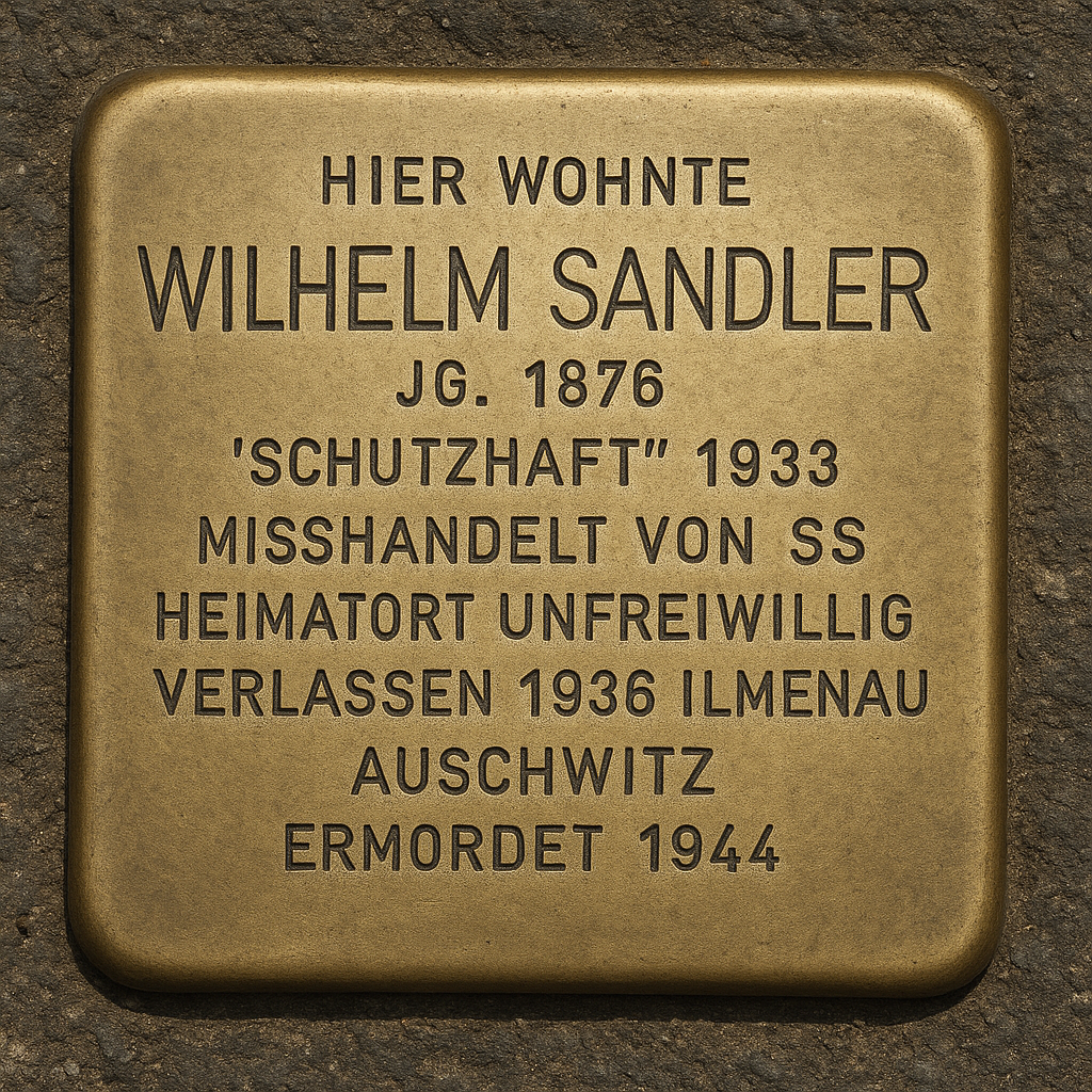 Nach der Aufgabe des Kaufhauses verzog Wilhelm Sandler zu seiner Schwester Helene nach Ilmenau, wo sein Schwager Samuel Gronner seit 1911 die Filiale des Herrengarderobegeschäfts Sandler erfolgreich geleitet hatte.[29] In der thüringischen Stadt hielt sich Sandler nur kurz auf. Aufgrund seines sich verschlechterten Gesundheitszustandes verzog er in ein jüdisches Altersheim in Frankfurt am Main, wo er die nächsten Jahre verbrachte.[30]