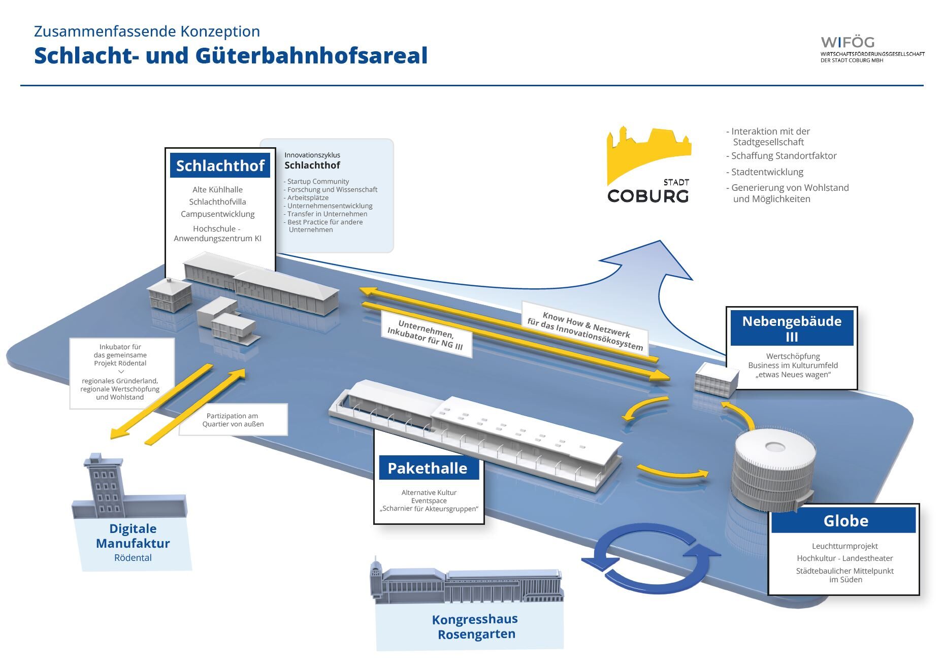 Mit dem Ende des Schlachthofbetriebs 2013 und dem Erwerb des Areals durch die Stadt Coburg entstand auf ca. 6 ha mitten im Stadtgebiet die Chance, ein neues urbanes Quartier mit eigener Identität zu gestalten. Ziel ist es, ein integriertes Zukunftsquartier zu entwickeln, das wirtschaftliche, kulturelle und wissenschaftliche Impulse vereint – angepasst an die Leistungsfähigkeit Coburgs.